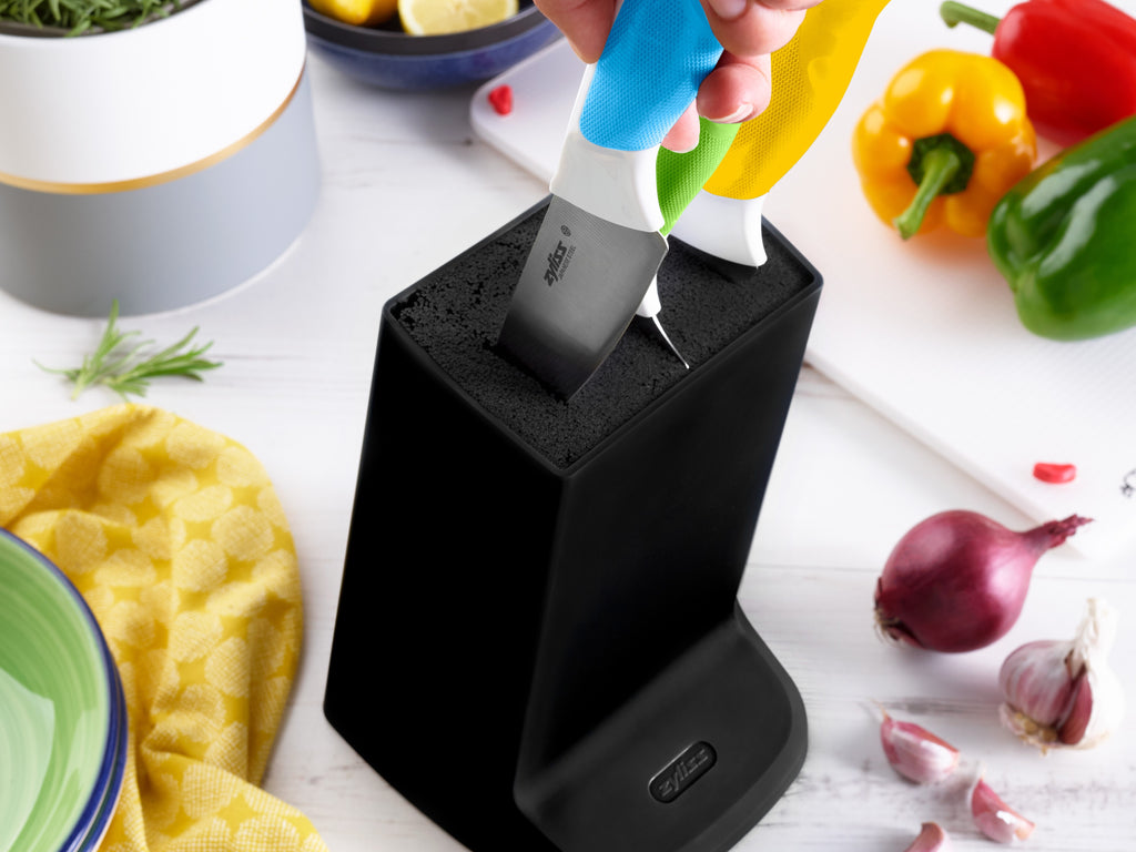 If you like to keep your cooking knives in easy reach, why not store them in a robust knife block? The flexible fibers in the Zyliss Comfort Pro Knife Block protect blades and move easily to accommodate different knife shapes and sizes. Practical, organized, and stylish.